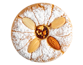 A delicious, round, and traditional almond cookie topped with powdered sugar and four whole almonds. Ideal for food blogs and recipes.