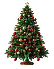 A beautiful Christmas tree PNG with a transparent background, decorated with lights and ornaments. Perfect for holiday cards, social media, and festive designs.