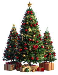 A group of decorated Christmas trees PNGs with gifts, all on a transparent background. Great for creating a festive holiday scene in your designs.