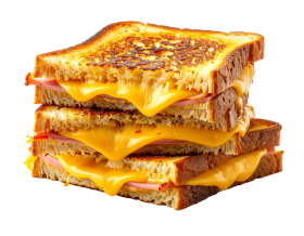 Delicious grilled cheese sandwich with melted cheddar and ham, crispy golden bread, isolated on white background, perfect comfort food for lunch or snack